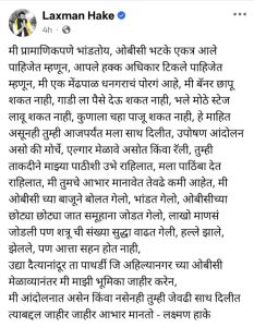 - अशा पोस्टमुळे आता नेमकं लक्ष्मण हाके काय निर्णय घेतात हे पाहणे गरजेचे ठरणार आहे. आता त्यांनी फेसबुक वर पोस्ट केली आहे काय निर्णय घेतात याकडे आता सर्वांचं लक्ष लागलेले आहे. लक्ष्मण हाके यांनी अशी पोस्ट का केली यावर आता प्रश्नचिन्ह निर्माण होत आहे.